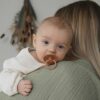 L’extérieur est bordé de lin beige. Avec des boucles sur l’extrémité opposée de la capuche pour pouvoir attacher la serviette au cou et avoir les deux mains libres pour sortir le bébé du bain. De 0 mois jusqu’à 2 ans.